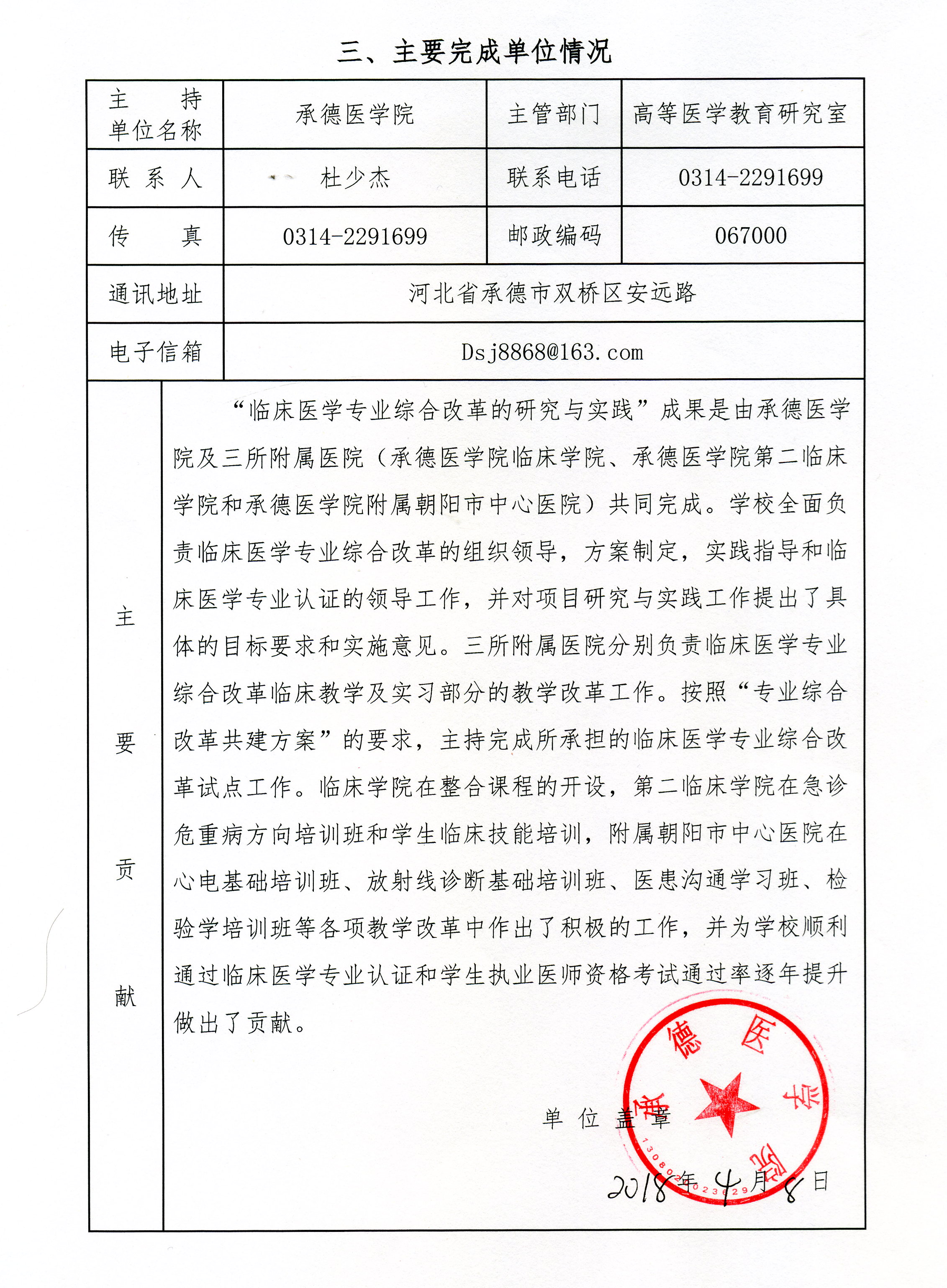 学校简介 承德医学院是一所隶属河北省政府领导的高等医学本科院校。创建于1945年9月,时称冀东军区卫生学校;1948年成为为中国医科大学第四分校;1949年5月,入驻热河省省会—承德,更名热河医学院;1982年12月,升格为本科院校,定名为承德医学院。1996年9月,通过国家本科教学合格评估。2001年河北省农林科学院特产蚕桑研究所并入我校。2003年7月,被国务院学位委员会批准为硕士学位授权单位。2006年10月,新校区投入使用并迁入新校区。2007年9月,在国家教育部高等院校本科教学工作水平评估中获得优秀。2013年11月,顺利通过国家教育部临床医学专业认证。学校2015年荣获“全国文明单位”称号,2017年通过“全国文明单位”复查验收,继续保留“全国文明单位”称号;附属医院2017年荣获“全国文明单位”称号 。 学校现有教职工2238人(含直属附属医院),其中专业技术人员1863人,正高职称203人、副高职称429人,博士和硕士1233人。现有专任教师1006人。有享受国务院特殊津贴专家、全国优秀教师、河北省突贡专家、省级教学名师、省级青年学科带头人、百人计划特聘专家、省“三三三人才工程”和中青年骨干教师70余人。有硕士研究生导师500多人,博士研究生导师7人,还聘请了40余名国内外知名学者为客座教授。2014年院士工作站获得批准成立。 现有本、专科在校生及全日制研究生9482人,来自全国28个省(自治区、直辖市)。其中在读硕士研究生723人,留学生248人。2006年开始招收外国留学生,2007年开始选送护理专业(专科)学生赴新加坡留学并获全额奖学金。与丹麦哥本哈根大学、日本札幌市立大学、韩国又石大学、美国印第安纳Dabney大学、马来西亚马来亚大学、意大利卡梅里诺大学等在内的多所国际性大学签署学生交流合作协议。 学校现有临床医学、中西医临床医学、中医学、护理学、医学影像学、麻醉学、中药学、应用心理学、针灸推拿学、康复治疗学、生物信息学、生物医学工程等12个本科专业和临床医学、护理学、医学影像技术、医学生物技术等4个专科专业。直属附属医院1所,非直属附属医院25所,教学实习医院64所,总床位达68000余张。有临床学院、护理学院、继续教育学院、基础医学院、中医学院、研究生学院、国际教育学院等7个学院及中药学系、心理学系、生物医学工程系、社会科学部、公共体育部、外语教学部等6个教学系部。 学校现有临床医学、基础医学、中药学三个硕士授权一级学科,涵盖了24个二级学科,其中临床医学、中药学、护理为专业学位授予学科。学校现有国家中医药管理局“十一五”重点专科1个、省级重点学科和重点发展学科8个、省级医学重点发展学科4个、省级临床重点专科建设(培育)单位17个、校级重点学科26个;临床医学、中药学、护理、中医、应用心理为专业学位授予学科,涵盖32个二级学科;国家级特色专业建设点2个、河北省本科教育创新高地2个、河北省品牌特色专业2个、省级“专业综合改革试点”项目3个;临床医学为地方高校第一批本科专业综合改革试点;卓越医生教育培养计划项目1个;卓越医生(中医)教育培养计划项目1个;省级精品课程9门;省级精品资源共享课程1门;省级精品在线开放课程2门;省级实验教学示范中心4个;河北省优秀教学团队1个;河北省大学生校外实践教育基地1个。 学校占地面积76.62万平方米,总建筑面积26.55万平方米;固定资产8亿元;教学科研仪器设备总值1.92亿元。中外文适用图书78.01万册。纸质期刊510种,拥有电子图书285万册和电子资源数据库10个(中国知网、万方数据库、超星读秀及百链学术搜索、EBSCO外文库、重庆聚合、新学术外文期刊、中文在线、新东方英语、高校考研互动精品课程、银符在线考试网)。 毕业生社会声誉良好。学校本科学生在全国大学生英语四级考试中,连续5年一次通过率在90%以上,在全国高校中处于领先地位。多次在河北省医学院校临床技能考核中,获得全省第一名。近年来,毕业生参加国家执业医师资格考试,通过率高于全国平均通过率5-13个百分点。建校70年来,学校培养3万余毕业生。大多数人已成为基层医疗单位的业务骨干和学科带头人。 学校秉承“仁爱至诚 知行合一”的办学理念,坚持“以学生为本,全心全意为学生成长成才服务”的理念关心学生,全员育人、全过程育人、全方位育人,把立德树人作为学校的根本任务。 主要贡献