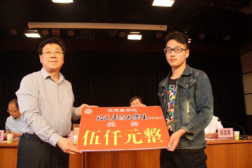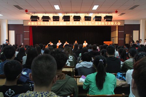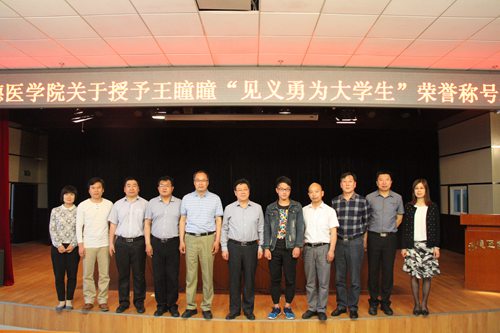 2016年5月23日下午,我校在图书馆八楼多功能厅召开授予王瞳瞳“见义勇为大学生”荣誉称号表彰大会。承德市双桥区宣传部副部长、文明办主任阎国春,学校党委书记刘永平,副校长宋鸿儒、唐世英,以及学校各职能处室负责人,各院系党总支、直属党支部书记出席大会,年级辅导员及200余位学生代表参加大会。学校办公室主任安文忠主持大会。国家、省、市级十余家主流媒体代表来到大会现场进行采访报道。 2016年5月22日中午十二点半左右,在避暑山庄水心榭湖边,一个三四岁的男孩不慎落入湖中,当时水已经淹没头顶情况紧急,孩子的母亲紧接着跳入湖中去救孩子,却因水性不好双双陷入险境。危急时刻一个飞快的身影跳入水中,向着母子奋力游去,就在母子俩即将被水淹没时,只见他一把抱起两人将他们奋力推向岸边,在岸边热心群众帮助下将母子二人救上岸来。这名救人的小伙子就是我校2015级生物医学工程系王瞳瞳同学。孩子妈妈上岸后心绪难以平静,感激得跪在岸边给他磕了几个头,王瞳瞳同学赶紧扶起孩子妈妈,随后便默默走开。王瞳瞳同学救人后,不留姓名返回学校。这一动人场景,恰巧被一名在场的游人目睹,用手机拍照记录下王瞳瞳同学救人全过程并发到微信朋友圈后迅速传播。承德市文明办,承德市双桥区文明办及新华网、新浪网、人民网等多家媒体关注,在社会和校园都引起强烈反响,大家纷纷称赞王瞳瞳同学见义勇为,舍己救人的事迹。为学校争得了荣誉,树立了我校良好的大学生形象。 副校长唐世英宣读了《中共承德医学院委员会关于授予王瞳瞳同学“见义勇为大学生”称号的决定》。授予王瞳瞳同学为“见义勇为大学生”称号,奖励5000元以资鼓励。 双桥区宣传部副部长、文明办主任阎国春宣读了《双桥区文明办关于授予王瞳瞳“双桥好人”荣誉称号的决定》。 伴随着激动人心的音乐,在台下观众热烈的掌声中,刘永平书记为王瞳瞳同学颁发“见义勇为大学生”证书和“见义勇为”奖金。阎国春主任为其颁发“双桥好人”证书。 副校长宋鸿儒同志宣读了《中共承德医学院委员会关于开展向“见义勇为大学生”王瞳瞳学习的决定》。决定中提到,我校长期积极开展对大学生进行社会主义核心价值观培育和教育,以发扬传统,开拓创新,围绕中心,为学校的稳定和发展提供了思想保证、精神动力和智力支持,有力地推动了全校各项工作的协调发展。王瞳瞳舍己救人的事迹,既是承德医学院全体师生的骄傲,也是承德人的骄傲,要大力弘扬之。习近平总书记说:“雷锋精神人人可学,奉献爱心处处可为”。校党委号召全校师生以王瞳瞳为榜样,学习其见义勇为、舍己救人的先进事迹,弘扬正气,为学校精神文明建设贡献自己的力量。 党委书记刘永平作重要讲话。他代表学校党委、行政和全体师生向可敬可爱的王曈曈同学表示最诚挚的祝贺。他讲到,王瞳瞳同学在他人生命遇到危险的紧急时刻,毫不犹豫,怀着一颗善良赤诚的学子之心,怀着一种对他人生命的敬畏之心,勇救落水母子,这种善行义举令人钦佩。一个青年学生深刻感知对国家、社会、集体、家庭和他人所负的责任,禀赋深刻的道德情感和坚定的理想信念,这种美德是一个民族最宝贵的品质,是一个社会最宝贵的财富。王瞳瞳同学的义举在承德医学院绝不是孤例,我们学校先后涌现出了获得首届感动承德十大人物的张兴隆同学;荣获“河北省十大爱心人物”的于芳兰老师;跳入冰冷的湖水中营救落水老人的田龙江同学;奋勇扑灭山火,无私保护国家电网的英雄群体;双塔山下及时施救使心脏病突发老人转危为安的5名同学;救送急性胃穿孔患者的王亮同学;志愿奉献,抗击艾滋的先进个人等等。这是“仁爱至诚,知行合一”的承医理念结出的硕果,是和谐友爱、不畏艰险、坚韧不拔、无私奉献的承医精神凝结的巨涛,这是承医健康蓬勃发展的不竭动力,是承医绵延至今的根,这是承医生生不息的魂。 他号召全校学生以王瞳瞳同学为榜样,学习他奋不顾身的英勇气概,学习他关爱他人的广阔胸怀,牢固树立正确的世界观、人生观、价值观,做习近平总书记号召的可爱、可信、可贵、可为的大学生,把青春之花绽放在祖国和人民最需要的地方,为承德医学院增光添彩,为中华民族伟大复兴贡献力量。 承德市避暑山庄管理处为王瞳瞳同学送来一面写有“舍己救人 品德高尚”的锦旗以及一封表扬信。部分社会爱心人士来到大会现场向其表示关心和慰问。 中央人民广播电台、承德电视台、承德市人民广播电台、承德日报、承德晚报等十余家国家、省、市媒体专程来到学校对王瞳瞳同学进行了采访。 王瞳瞳同学对学校以及双桥区文明办的表彰以及全校师生、社会各界对于自己的关心、肯定与支持表示感谢,对母子平安获救表示欣慰。简单质朴、不善言辞的王瞳瞳同学在被记者问及在跳入水中之前是否考虑自身安危时,腼腆地一笑,说到:当时情况危急,一心只想着救人,其他的什么都没有想,母子平安就是他唯一的念头。王瞳瞳表示,作为一名普通的大学生,面对生命受到威胁的紧要关头,竭尽全力,帮助他人,挽救生命只是一名承医人的正常表现,今后的学习生活中,会继续严格要求自己,不断提升自己,使自己有能力去帮助更多的人,做一名无愧于自己、无愧于学校、无愧于社会的承医人。