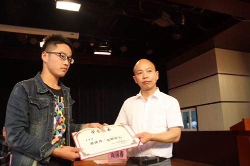 党委书记刘永平为王瞳瞳同学颁发“见义勇为大学生”荣誉证书