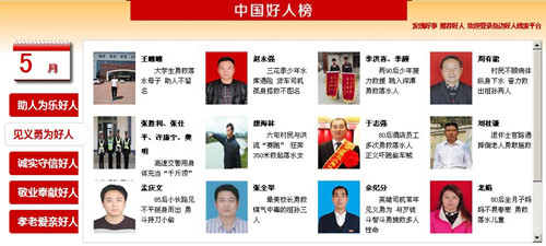 新闻链接: 中国文明网:中央文明办发布5月“中国好人榜”http://www.wenming.cn/sbhr_pd/tt/201605/t20160531_3401345.shtml