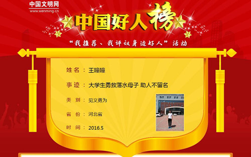 河北省人民政府网站: 承德医学院学生王瞳瞳荣登5月“中国好人榜”http://www.hebei.cn/hebei/11937442/10756595/10756617/13425007/index.html