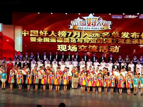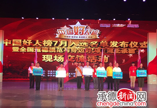 【转载】 中国好人榜7月入选名单发布仪式在承德举行 承德新闻网讯(记者 孟健)7月29日,由中央文明办主办,中国文明网、河北省文明办、中共承德市委、承德市人民政府联合承办,中共承德市委宣传部、承德市文明办、承德广播电视台共同协办的“中国好人榜”7月入选名单发布仪式暨全国道德模范与身边好人现场交流活动在承德大剧院盛大举行。中央文明办秘书局局长张朝生,省委宣传部部务会成员、省文明办专职副主任李秀存出席活动。8月中国好人榜发布城市黑龙江省哈尔滨市文明办主任应邀参加了本次活动。作为市委理论中心组的一次重要集中学习,市领导周仲明、常丽虹、郭群、韩福才、赵险峰、阮树平、张庆祥、刘文勤、陈德光、于庆贺、郭椿、张树民、王学、孙林等参加活动。市直部门主要负责同志各界干部群众代表、志愿者们也参加了本次现场交流活动。