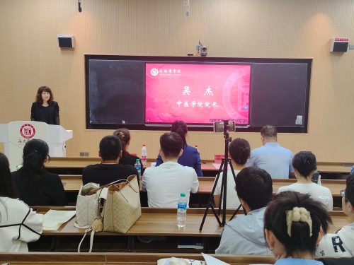 中医系主任吴杰致词 随后,与会领导为新生代表佩戴校徽。胸前闪耀的校徽,勉励每位同学弘扬“政治坚定、仁爱至诚、敬佑生命、甘于奉献”的承医精神,恪守“严谨、求实、勤奋、创新”的校训,共同谱写强国复兴有我的青春奋斗乐章。