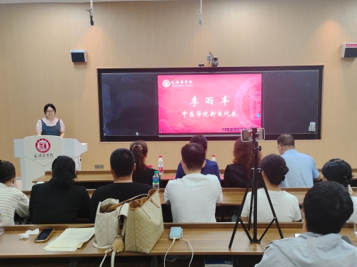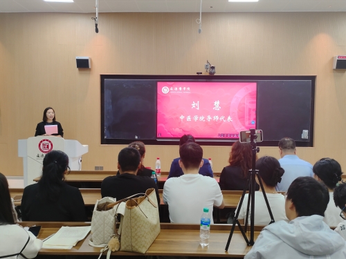 与会领导为新生代表佩戴校徽 中医系教师刘慧作为研究生导师代表发言,她以未来导师与同行者的身份对各位研究生新生们分享了感悟,希望同学们在品德方面,厚德载物;在学术方面,独立思考;在态度方面,自信专注,担时代重任,做守护健康的“精诚大医”。