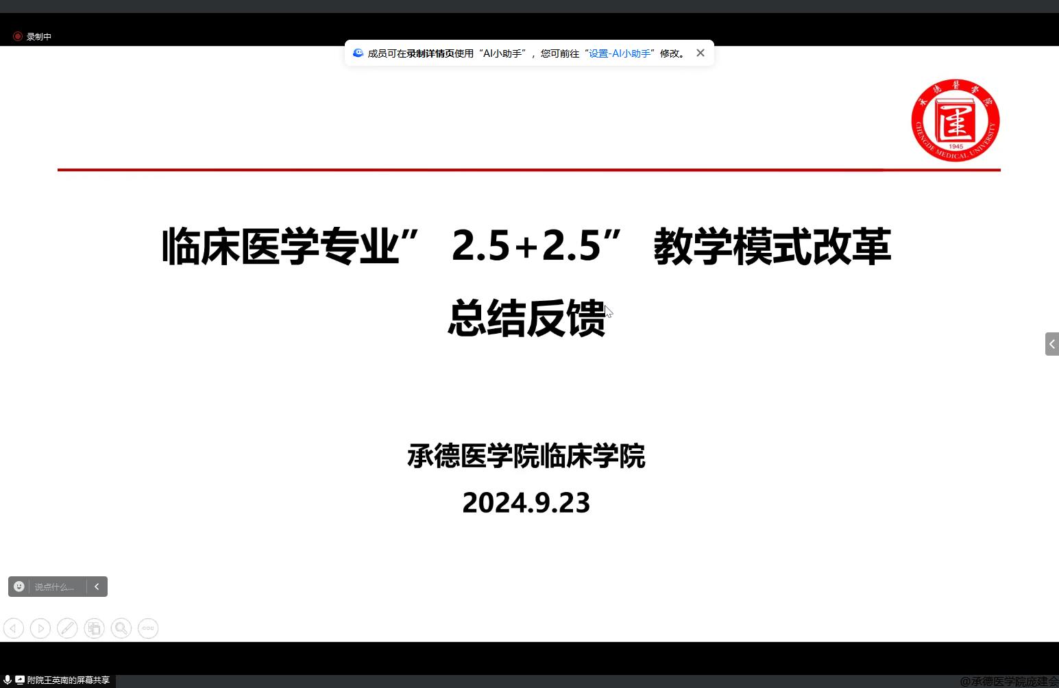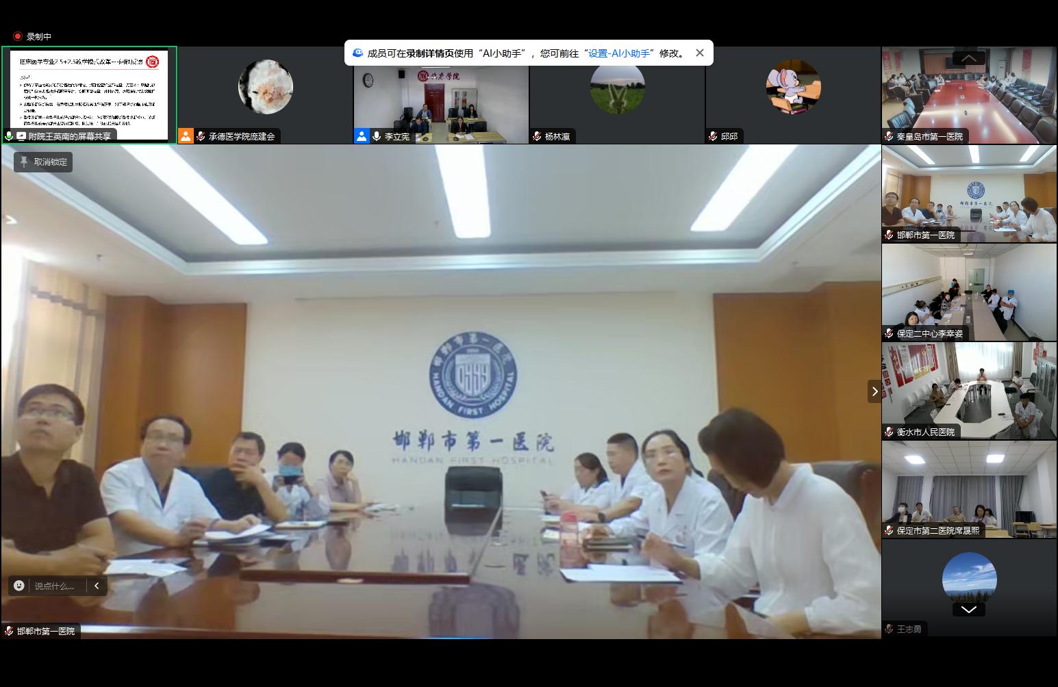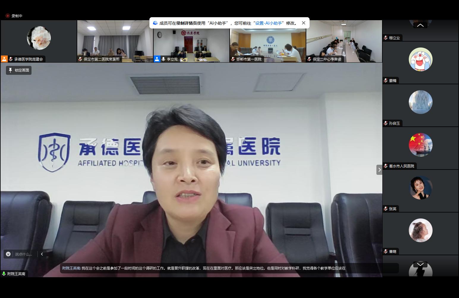 参会医院 2024年我校在六所教学医院对2021级临床医学专业首次推行“2.5+2.5”培养模式,附属医院教育处处长王英南、承德市中心医院崔瑜老师分别针对该教学模式中桥梁课程教学过程、考核方案、考试成绩进行总结分析,分享了师资遴选、师资培训、监督机制、激励制度等提升教学效果的措施和建议,针对存在的问题提出整改方案。