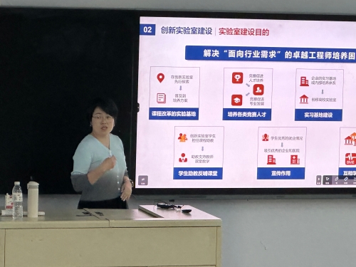 生物医学工程学教研室主任董现玲宣讲 贝翠琳主要围绕医疗器械工程人才培养的现状、创新实验室建设等展开讲解,指出创新实验室不仅能培养各类竞赛人才,还能推进实习基地建设,激发学生参与科学研究的热情,形成学生助教反哺课堂的良性循环。郑金钰表明创新实验室的建设为学生提供了良好的学习机会,使其能够获取更加优质的教育资源和技术支持,为学生创新发展提供孵化平台。另外后续将建立卓越工程师协会,学生参与管理与建设,更好地发挥学生的综合能力。希望同学们把握机会,积极参与,发挥聪明才智,让创新实验室建设得更好。董现玲指出实验室场地不仅提供了完善的学习平台,还实行严格的双向选择、考勤及淘汰制度,为解决行业人才难题、推动医工融合发展提供有力支持。