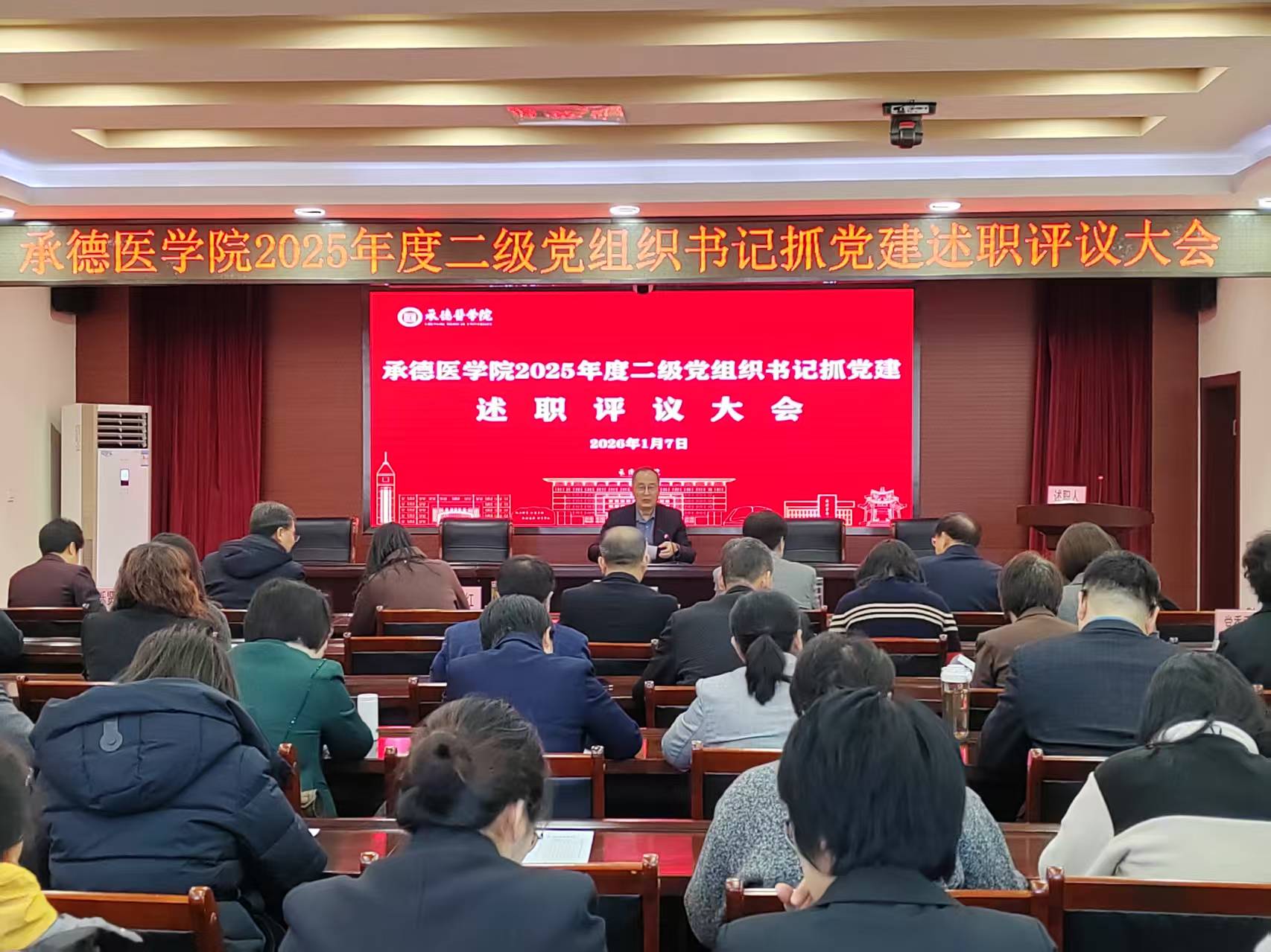 为深入学习贯彻党的二十大和二十届历次全会精神,全面落实习近平总书记关于党的建设的重要思想,压实基层党组织书记管党治党政治责任,推动基层党建工作高质量发展,2026年1月7日上午,我校在行政楼412会议室组织召开2025年度二级党组织书记抓党建述职评议大会。校领导、党委委员、二级党组织书记、教师代表参加会议。会议由学校党委书记唐世英主持。 会上,14位二级党组织书记围绕基层党建工作实际、服务教育教学工作、服务医科大学建设工作依次进行述职,并查摆了存在的问题与不足,提出了下一步改进思路与举措。唐世英对各二级党组织书记述职情况进行逐一点评。会议指出,2025年是“十四五”规划收官之年,全校各二级党组织坚持以习近平新时代中国特色社会主义思想为指导,认真贯彻落实新时代党的建设总要求和新时代党的组织路线,围绕落实学校第五次党代会精神,在配合省委巡视、迎接本科教育教学审核评估、举办建校80周年系列活动、推动“医科大学”建设等重点任务中,充分发挥了战斗堡垒作用,为学校内涵式高质量发展提供了坚强组织保障。同时,指出了各二级党组织在理论学习转化、组织活力激发、党建与业务融合深度、品牌特色打造、人才作用发挥等方面存在的共性与个性问题。